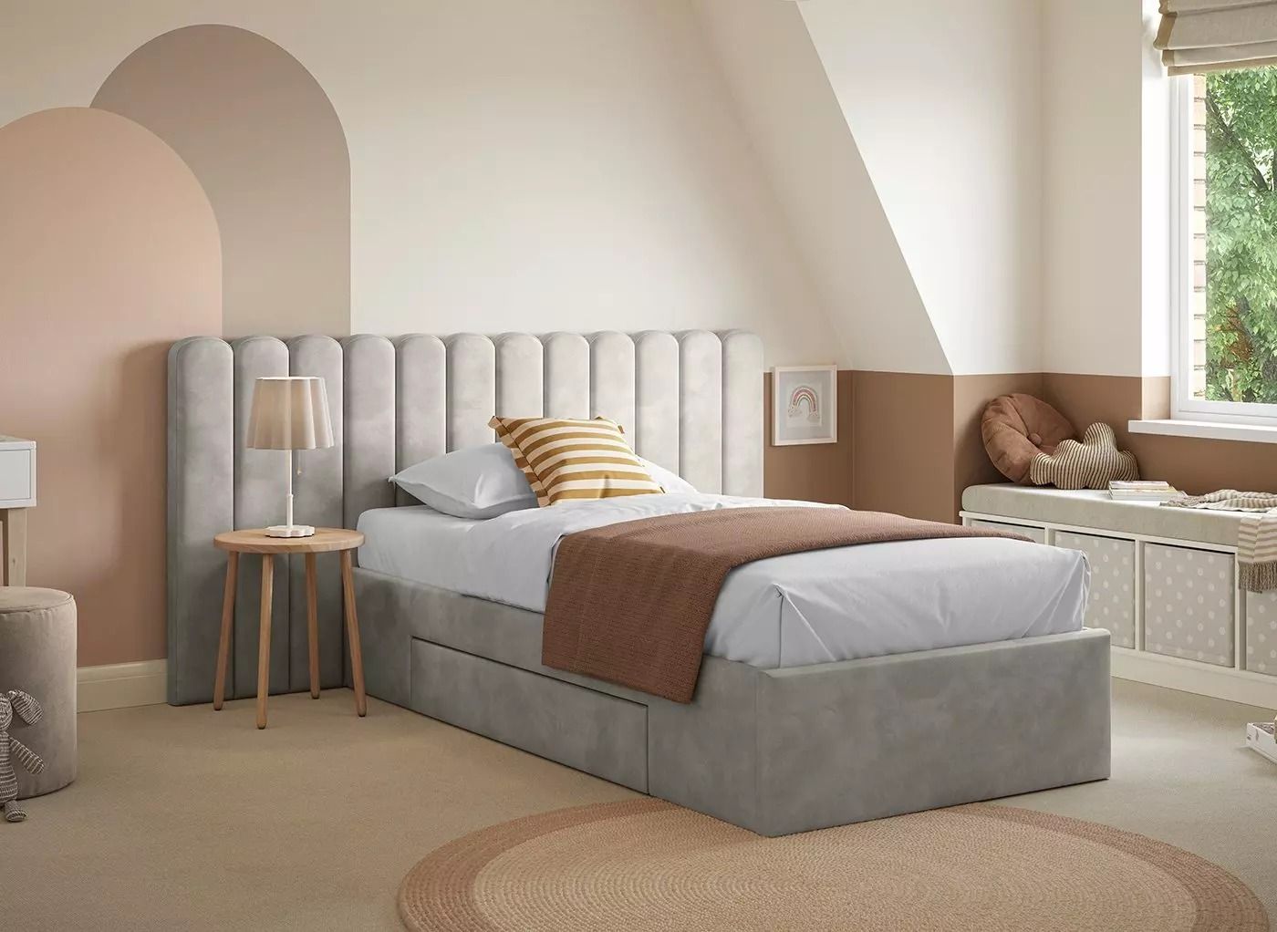 Some kids can't wait to grow up, so they need a sophisticated bedroom to match. Introducing the Callie Hotel Bed. This lavish hotel-style bed features a wide headboard with a soft curved design, adding a touch of theatre to any kids' bedroom. Its soft grey velvet finish completes the premium look and conceals a sprung slatted base for extra mattress support.