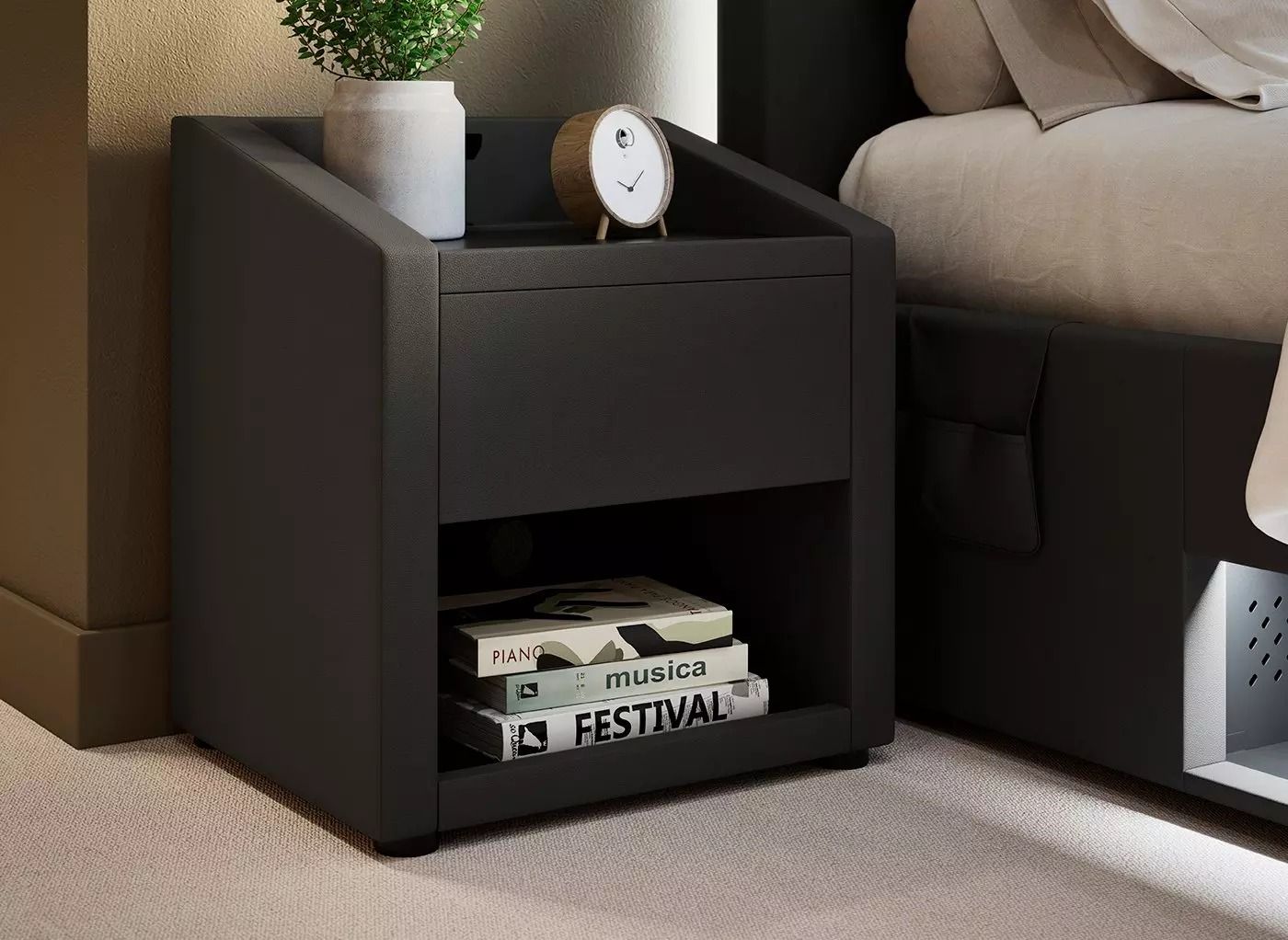 The Quantum's built-in lighting illuminates the headboard and media tray, casting light onto the wall behind the bed to add instant atmosphere.