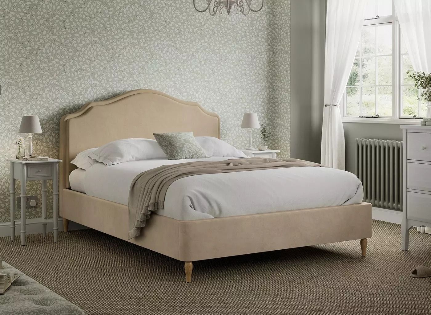 The Ronnie bed frame is simply stunning. With its creamy latte tones and beautifully sculpted headboard, this bed adds instant elegance to any space at a price you won't lose sleep over. The Ronnie bed is wrapped in smooth velvet-touch fabric, accented by natural wooden feet.