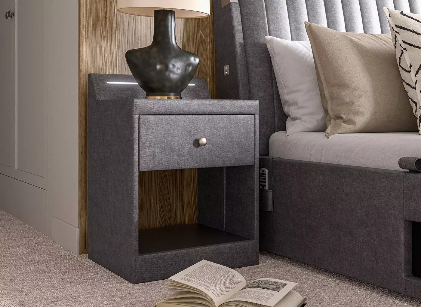 To store your tech essentials, utilise the handy media tray or generous side-opening ottoman storage. With rich velvet-touch fabric upholstery throughout the design